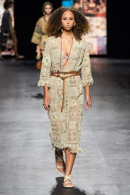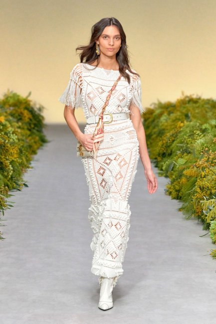 SportmaxПлатья, сшитые в технике кроше или макраме, бахрома, кисточки, пэчворк, узоры tie-dye и ажурные вставки вновь покорили сердца дизайнеров по всему миру. В центре внимания коллекций сезона весна-лето 2021 оказались богемные образы и эстетика конца 1970-х. Так, Zimmermann показакали белоснежное платье из деликатного плентения с бахромой на рукавах, Christian Dior воспели исскуство пэчворк, а Gabriela Hearst продемонстрировали ажурное платье, напоминающее плетение крючком.