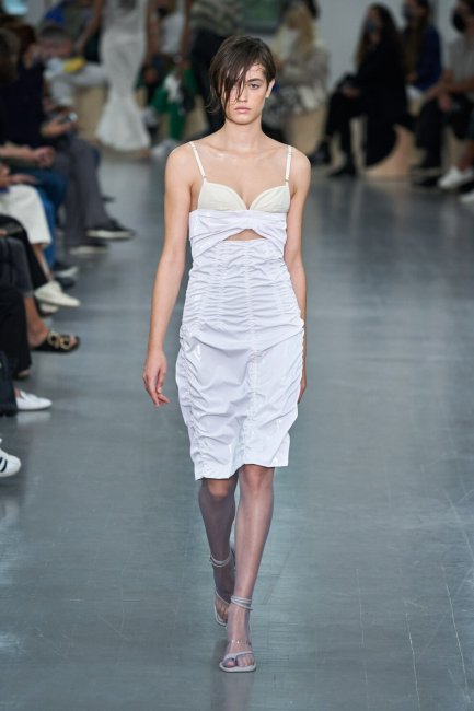 Miu MiuПлатья с тонкими лямочками смело можно отнести к одному из самых сексапильных трендов этого сезона. Изящные бретельки, тонкие перемычки и тонкие лямки вдвойне подчеркивают хрупкость и утонченность женской фигуры. Достаточно лишь взглянуть на коллекцию Jacquemus и сразу возникает желание приобрести себе все образы на тонких бретелях, например это черное платье из трикотажа. В коллекции Victoria Beckham изысканные бретельки –единственное на чем держится шелковое элегантное платье, а у Dion Lee весь образ состоит из них и сборок, благодаря чему можно регулировать глубину вырезов.