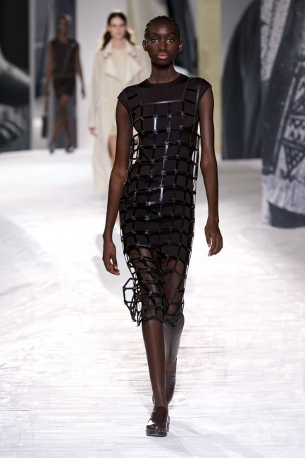 Off-WhiteПлатья, напоминающие рыболовные сети, не отпускают фантазию дизайнеров. Этой весной платье-сетку модно носить поверх футляра, повторяющего цвет кожи обладательницы. Подобные примеры можно найти в коллекциях Hermes и Ports 1961. Если же хочется более вечернего варианта, то у Balenciaga представлена серебристая сетка в длине макси, которую можно надеть поверх черного комбинезона и ботильонов такого же оттенка, благодаря чему достигается эффект бесконечных ног.