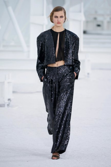 Louis VuittonЭкстравагантный и экзотический стиль диско возник в 70-х, когда танцполы заполонили энергичные парни и девушки, двигающиеся в такт ритмичной музыке и разноцветных софитов. Мини-юбки, кроп-топы, комбинезоны и брюки-клеш захватили модную повестку того времени и получили новый виток славы в сезоне весна-лето 2021. Блестящие наряды тогда стали основой гардероба в стиле диско, что продолжают дизайнеры и сегодня: костюмы от Louis Vuitton и Chanel с брюками-палаццо не оставят никого равнодушными и вне танцпола. Передать особый шарм тех времен решились Balmain – к сверкающему комбинезону Оливье Рустен добавил жакет с гипертрофированной линией плеч.