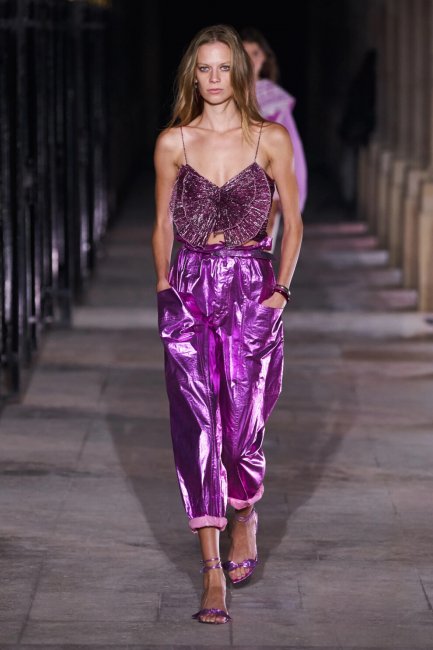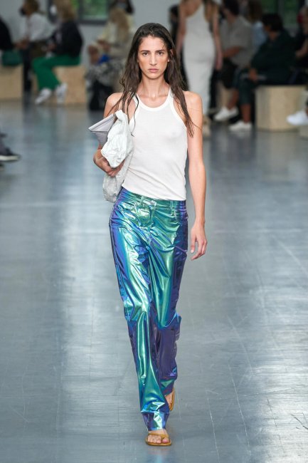 Acne StudiosШикарные мини в новом сезоне сменились на чуть более спокойные миди-платья. Такие блестящие, во всех смыслах, модели можно было увидеть в коллекциях Celine и Paco Rabanne. Стокгольмский бренд Acne Studios же представили платье из купро с крэш-эффектом – в таком ноги сами просятся поскорее перенестись на танцплощадку. Еще одним неотъемлемым элементом стиля диско можно по праву считать брюки ярких цветов с металлизированным эффектом. В ход здесь идут неоновые оттенки, как в коллекции Sportmax и Isabel Marant. Такие брюки, несмотря на свою неоднозначность, универсальны и практичны – они не требуют никакого дополнительного обыгрывания и неприхотливы в стилизации. Достаточно добавить к ним белую майку-алкоголичку и однотонные босоножки на каблуке.