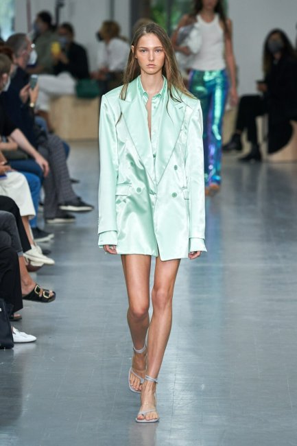 BossВ этом сезоне весна-лето 2021 коллекция Boss была посвящена монохромной пастели. Вслед за серией образов в небесно-голубом цвете и бежевой гамме, на подиуме появились платья, брючные костюмы, ветровки и тренчи в оттенке перечной мяты. Sportmax решили разнообразить свою повседневную коллекцию эффектным вкраплением в виде атласного двубортного жакета, который подошел был для самой шумной летней вечеринки.
