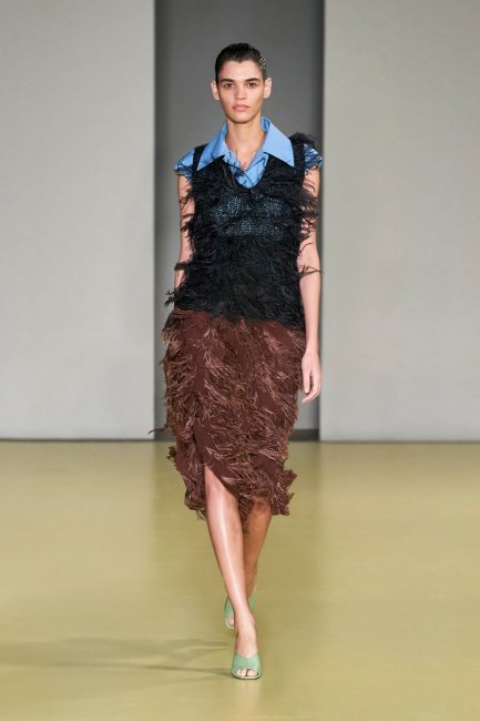 KOCHEПразднику бытьКоллекция No.21 всем своим видом намекает, что в ближайшую пятницу должны быть танцы, а лучшим образом для них будет юбка с перьями. Во-первых, она эффектно смотрится в движении, а во-вторых, ее можно носить как с роскошным шелковым жакетом и туфлями-лодочками, так и чем-то более простым, например, белой майкой и слайдерами.