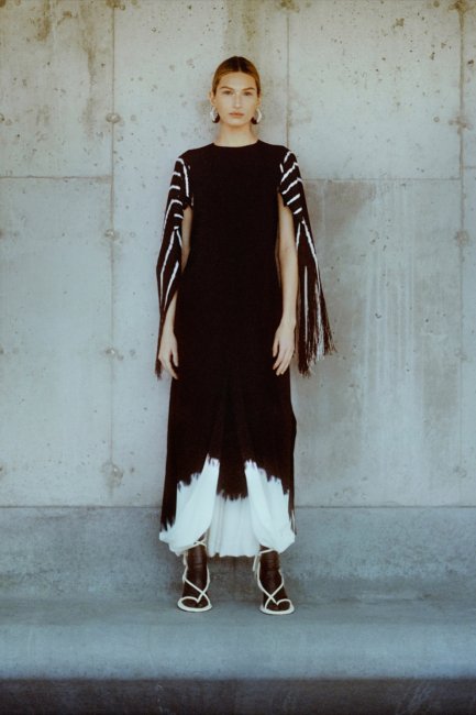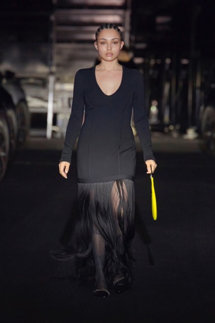 Для вечерних выходов дизайнеры также хорошенько потрудились. Альберта Феррети предложила золотое длинное платье с кристаллами и блестящей бахромой в тон ткани, а Мэттью Уильямс решил сделать ставку на полупрозрачное платье с черной тонкой бахромой на подоле. Тем временем Алессандро Дель Аква пошел другим путем, отталкиваясь от будуарной эстетики. В коллекции No.21 главные позиции заняли платья в бельевом стиле, например, дерзкое мини с с бахромой. Что касатеся Sportmax, то бренд соединил платье, полностью состоящее только из поперечных полосок изящной бахромы, с прямыми брюками.