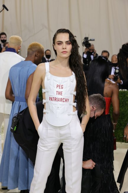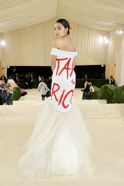 Анок Яй в Oscar de la RentaЧтобы продемонстрировать свою социально-политическую позицию многие знаменитости предпочли надеть образы, украшенные лозунгами. Так, американский политик Кэролин Б. Малони надела платье с длинным шлейфом, расшитым лозунгами «равные права для женщин» и YES ERA!. Высказаться решила и Кара Делевинь - том-модель появилась в корсете Dior и призвала разрушать патриархат, а конгрессвуман Александрии Окасио-Кортес надела белое платье, расписанное красными буквами, которые гласили «налоги для богатых».