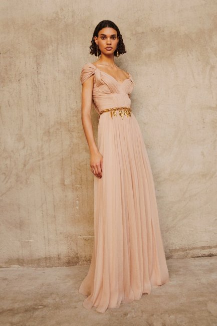 Платья, отсылающие к классическим античным, представили Alberta Ferretti и Dior. Итальянский бренд сделал ставку на V-образный вырез и искусно выделенную линию плеч. Для того, чтобы подчеркнуть талию, дизайнер добавила золотую цепь с лавровыми листьями. Мария Грация Кьюри также оттенила молочное макси-платье золотыми акессуарами: монолитным поясом, браслетами-каффами и кольцами. Актуальности образу добавила обувь - кроссовки на массивной подошве. Elie Saab же представили вариант на одно плечо, словно пришедшую со времен Древней Греции.