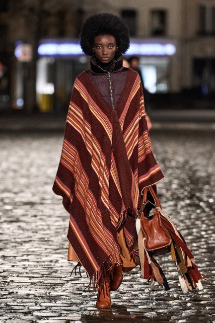 Пончо в стиле хиппиChloeВ этом сезоне нашлось место и для эстетики хиппи, и звездной одеждой стало не что иное, как пончо. Как в укороченном варианте, например, от Anna Sui, так и в интерпретациях XXL, предложенных Etro или Chloé, пончо выбралось в лидеры тенденций среди верхней одежды. Идеально подходит для нестабильной осенней погоды.