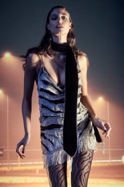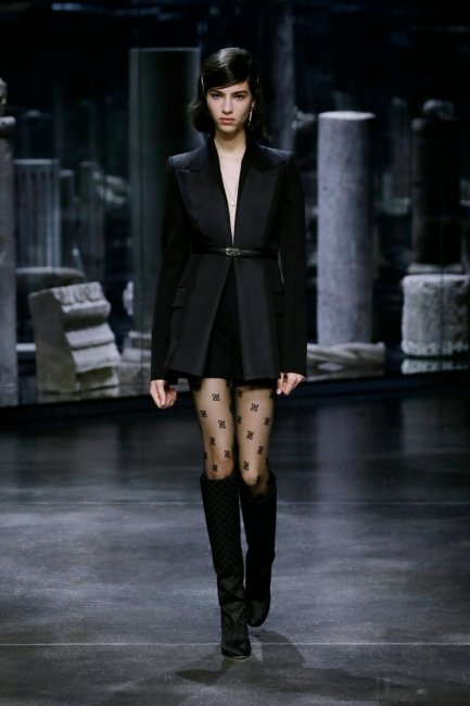 Saint LaurentНе стоит списывать со счетов классические капроновые черные колготки, они по-прежнему возглавляют списки самых востребованных пар, став вневременным элементом образа. Вы можете рифмовать полупрозрачные колготки как с вечерними, так и с повседневными образами. Тонкие колготки не играют утепляющую роль в образе, но они могут выигрышно завершить выбранный вами ансамбль. Так, носите их с клетчатой юбкой, рубашкой и объемным кардиганом на работу, как предлагает Alessandra Rich, или сочетайте с роскошным блестящим нарядом для светского мероприятия по примеру Saint Laurent.