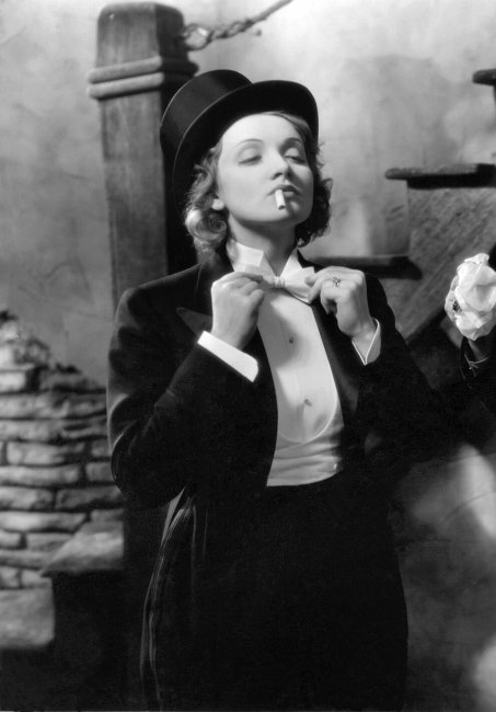 Кадр из фильма "Морокко"Мы предлагаем соединить классический смокинг с чем-то более неформальным, чтобы было удобно танцевать всю новогоднюю ночь. Как насчет металлизированных узких брюк вместо привычной костюмной пары?