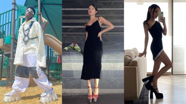 Трейси Эллис Росс, Хейли Бибер и Кэти ХолмВысокая платформаВ 2021 году модным балом правила обувь на высокой платформе. Так, туфли и ботильоны на массивных каблуках и скрытой платформе показали в своих коллекциях Versace, Simone Rocha, Prada, Moschino и Schiaparelli. А такие звезды, как Ариана Гранде, Оливия Родриго и Lil Nas X показали как вписать подобную обувь в свой гардероб.