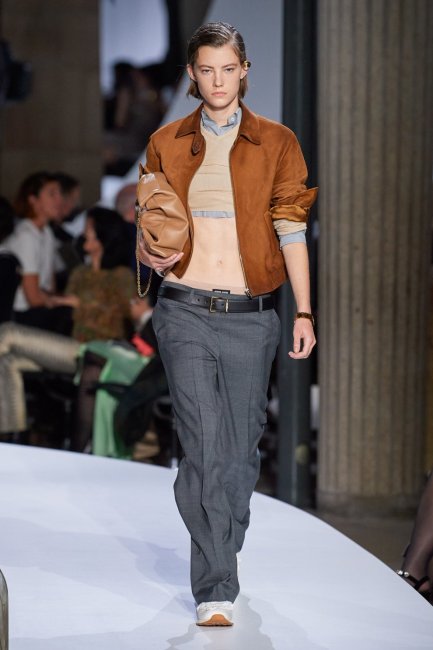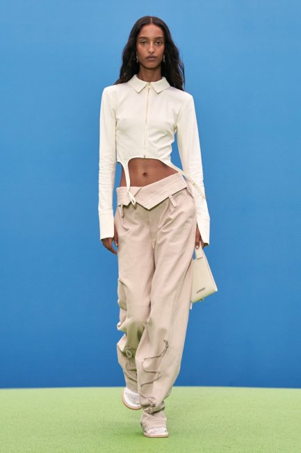 Брюки с низкой посадкойMiu Miu, весна-лето 2022Низкая посадка триумфально вернулась в тренды сезона весна-лето 2022: будущей весной в ход пойдут и классические брюки, и карго, и бермуды. Носить низкую посадку можно уже сейсас - например, следуя показу Jacquemus, с укороченной рубашкой, а защиту от холодного ветра в таком случае обеспечит пальто или дубленка кроя oversize.