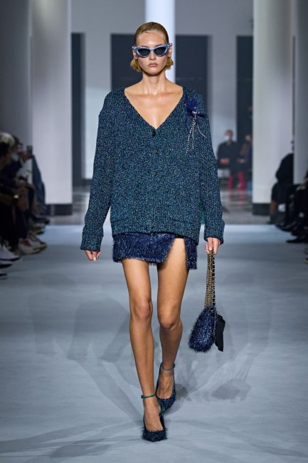 LanvinМикро-юбкиЕсли в 2021 году в моде были мини-юбки, то в 2022 дизайнеры разошлись не на шутку и представили микро-варианты. Пожалуй, самую провокационную короткую юбку показала Миучча Прада в своей коллекции Miu Miu весна-лето 2022. Дизайнер предложили надевать микроскопическую юбку с заниженной талией в паре с о свитерами и рубашками. Тем временем, маленькая цветастая юбка появилась на подиуме Christian Dior, а металлизированный вариант в коллекции Missoni.