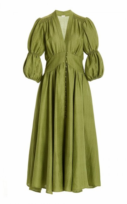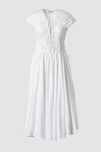 Jil SanderАмпир является определяющим типом декольте и в коллекциях Pre-fall 2022. Erdem — один из пришедших к нему дизайнеров. В коллекции бренда — платья с V-образным вырезом, выделенным контрастной строчкой ниже груди. Jil Sander также представили несколько платьев, соответствующих этой тенденции. Одно из них — с бахромой, а другое отсылает к греко-римскому силуэту.