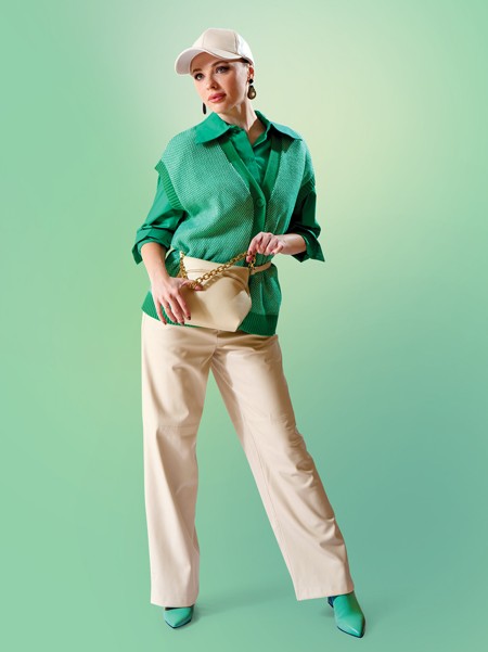 Модная палитра весны в бутиках «Республики». Стилист: Елена Новоженова, модель: Анна Тарасова, фото: Наталия Алексеева Синий В красивый синий цвет мы окрасили образ в стиле total knit – в трикотаж по-прежнему модно одеваться с ног до головы. И еще пара трендовых вещей сезона — бомбер и аксессуары с крупными цепями. Брюки, жакет, куртка – Sela Сумка – Love Republic Серьги – Lady collection Фуксия Мини-платье самого актуального оттенка этого сезона Very Peri в сочетании с oversize- тренчкотом в оттенке фуксии и белыми ботильонами делает образ одновременно ультратрендовым и очень женственным. Платье, плащ, сумка – Love Republic Ботильоны – Grand Gudini Серьги – Lady collection Зеленый Образ в хорошо узнаваемой стилистике Gucci выглядит ярко за счет зеленого, самого хитового цвета последних сезонов. Широкие брюки из экокожи скомплектованы с рубашкой и жилетом в стиле семидесятых. Современности добавят аксессуары: кепка и сумочка с цепью. Жилет, блуза, брюки – Sela Бейсболка, сумка – Love Republic Ботильоны – Grand Gudini Серьги – Lady collection Лазурный Дерзкое сочетание классических брюк со спортивным худи — дань стилю «спорт-шик». Поддержим образ жилетом в тон брюк, ботинками на массивной подошве с актуальным квадратным мысом и вместительной сумкой-шопером. Брюки, жилет, джемпер, сумка – Love Republic Ботильоны – Grand Gudini Cерьги – Lady collection