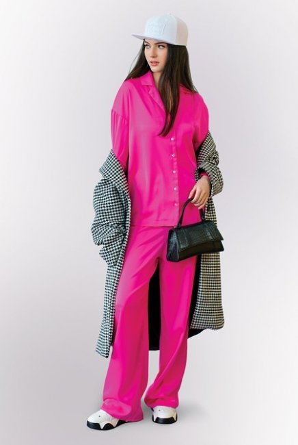 Пижамный костюм Пижамные костюмы легко стилизуются с классикой и спортом. Incity Пальто – 7 599 руб. Брюки – 2 599 руб. Блуза – 2 799 руб. Сумка – 3 399 руб. Кепка – 1 599 руб. Grand Gudini Кроссовки – 5 800 руб.
