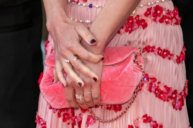 Клеманс Поэзи в ChanelИздалека ее образ, состоящий из тонкого вязаного топа и юбки в пол, выглядел достаточно скромно, но при ближайшем рассмотрении становится заметна сложнейшая цветочная аппликация, украшающая подол. Поддержала легкое настроение наряда актриса сумкой Chanel в этой же цветовой гамме и тонкими украшениями с жемчужинами.