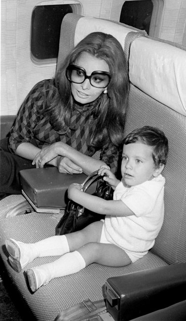 Софи Лорен с сыном Карло в аэропорту в Нью-Йорке (1971)