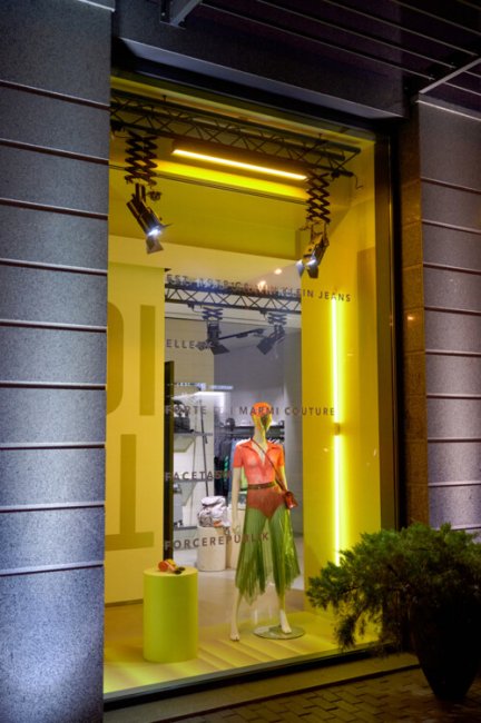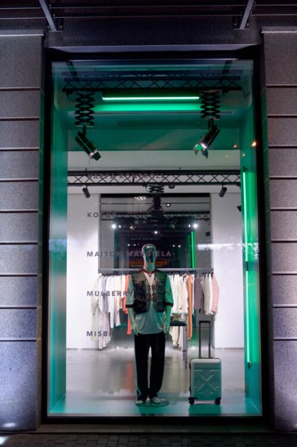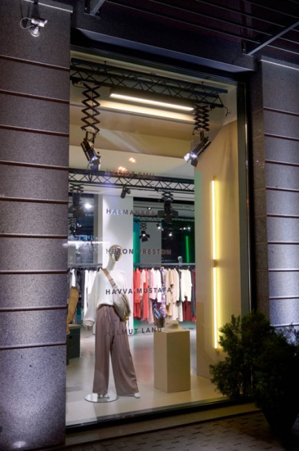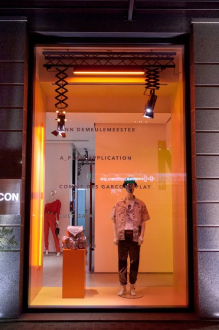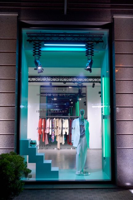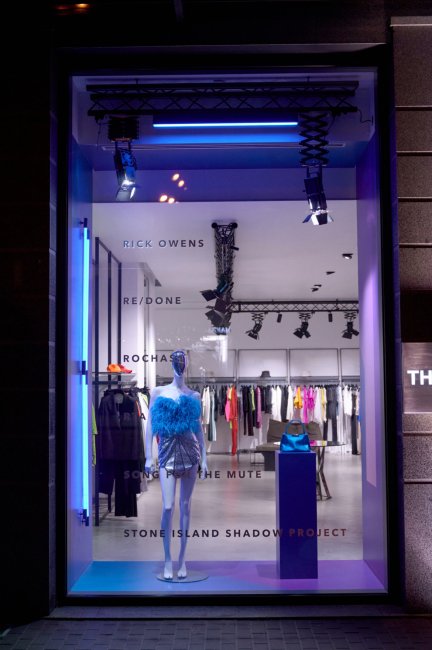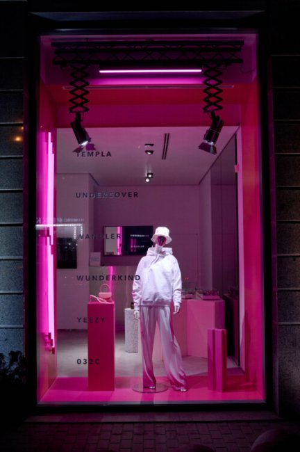THE ICONКреативная команда THE ICON в коллаборации с AKZ ARCHITECTURA устроили неоновое светопредставление, раскладывая солнечный свет в спектр: каждую витрину заполнили яркие огни желтого, синего и фуксии. В отблесках таких космических рассветов и закатов расположились манекены, одетые в деконструированные жакеты, свободные костюмные двойки и футуристичного вида спортивные комплекты.