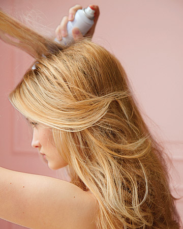 От середины пробора и до макушки прядь за прядью обработайте корни лаком для волос.