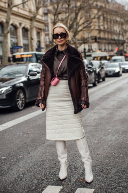CoachПреимущество высоких сапог в том, что они будут смотреться одинаково хорошо как с кожаной мини, так и с юбкой длины миди. Hermes предлагают рифмовать темную обувь с более светлой одеждой, а модницы чаще всего выбирают сапоги в одном оттенке с юбкой, тем самым удлиняя и оттачивая силуэт.