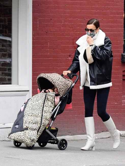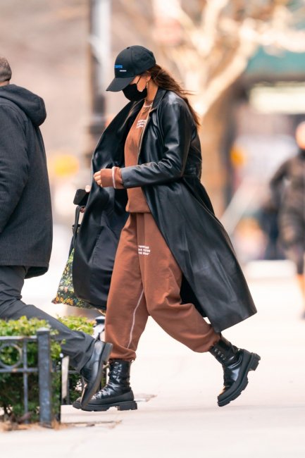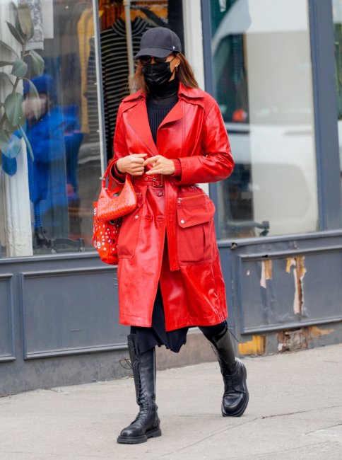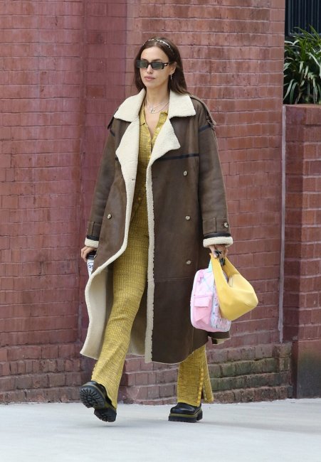 Погода в Нью-Йорке переменчива, поэтому в течение зимы Ирина Шейк не только куталась в объемные шубы или пуховики, но и нередко выбирала элегантные кожаные тренчи. Пример модели доказывает насколько функциональна эта вещь, ведь смотрится одинаково уместно и со спортивным костюмом, и грубой обувью.