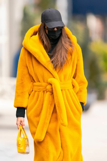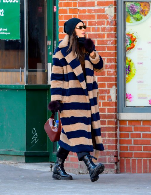 Как только на улице становится холоднее топ-модель мгновенно вспоминает про яркие длинные эко-шубы у себя в гардеробе. Несколько дней назад на улицах Нью-Йорка она была замечена в горчичной шубе-халате в пол украинского бренда Olenich, а до этого спасалась от непогоды моделью в крупную полоску.