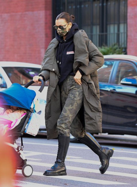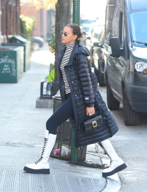 Ирина Шейк родилась в достаточно суровых климатических условиях, поэтому прекрасно знает, что такое настоящие холода. Этой зимой одним из любимых ее сочетаний стал дуэт длинного пуховика, в котором не страшен никакой ветер, и грубых сапог на манер армейских. Идеальное комбо для длительных прогулок в любую погоду.