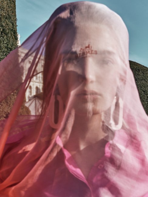 Блуза Vivetta, платок и серьги HermesНа рассвете