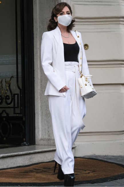Леди Гага в платье CelineДля своей личной коллекции Гага выбрала белоснежный брючный костюм Max Mara, состоящий из элегантного жакета и свободных брюк с защипами. Актриса надела брючный ансамбль в паре с базовым боди Wolford, черными туфлями на высокой платформе Pleaser и белой сумкой Valentino. Чтобы завершить свой образ, Гага сделала прическу в стиле гламурной бизнес-леди того периода.