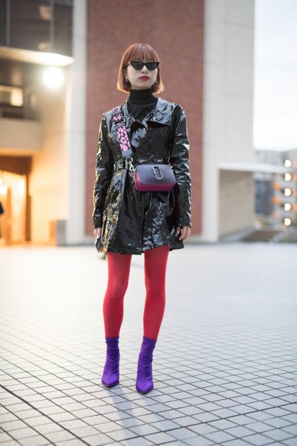 Алые колготкиТакие образы стали лидерами на токийской неделе моды сезона осень-зима 2021/2022. Японские модницы переосмыслили стилизацию изысканных платьев с помощью игривых сумок и ярких колготок - нескучный весенний образ во всей красе.
