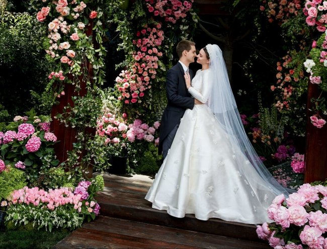 Эван Шпигель и Миранда КеррМиранда Керр шла под венец в классическом свадебном платье с длинными рукавами Christian Dior Haute Couture авторства Марии Грации Кьюри и перламутровом венке Stephen Jones. А роскошное в своей простоте платье завершал букет ландышей, который дополнительно подчеркивал ощущение невинности и чистоты. В экслюзивном видео, снятом Vogue US, Керр рассказывает, что источником вдохновения для ее платья стал свадебный образ Грейс Келли и его безвременной стиль. Для того, чтобы создать этот роскошный наряд, понадобилось всего две примерки.
