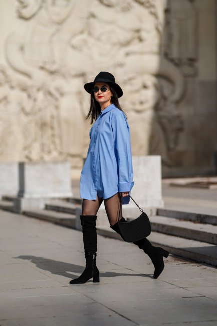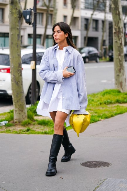 С сапогамиВысокие сапоги - настоящая must have позиция вот уже несколько сезонов. Лучшей партией для них этой весной станет удлиненная голубая рубашка, которую можно носить и соло - в качестве мини-платья. Непринужденность образа подчеркнут аксессуары: фетровая федора, солнцезащитные очки в металлической оправе и объемные, будто "игрушечные" сумки.