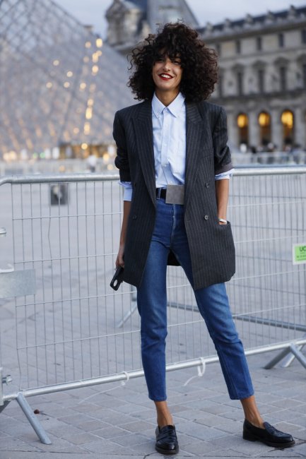 С жакетомОбъемный, с гипертрофированной линией плеч, словно заимствованный из мужского гардероба, жакет как нельзя лучше обыграет незамысловатую рубашку нежно-голубого оттенка - советуем остановить свой выбор на сорочке с практически полным отсутствием декора. Дополнить наряд можно лоферами, которые так же перекочевали из мужского гардероба и уже неразрывно связаны и с женской атрибутикой.