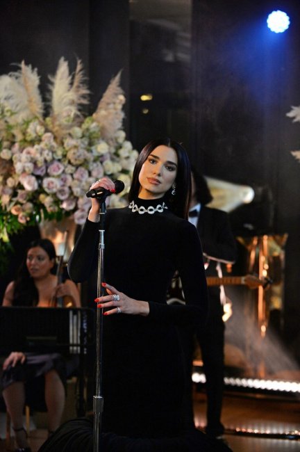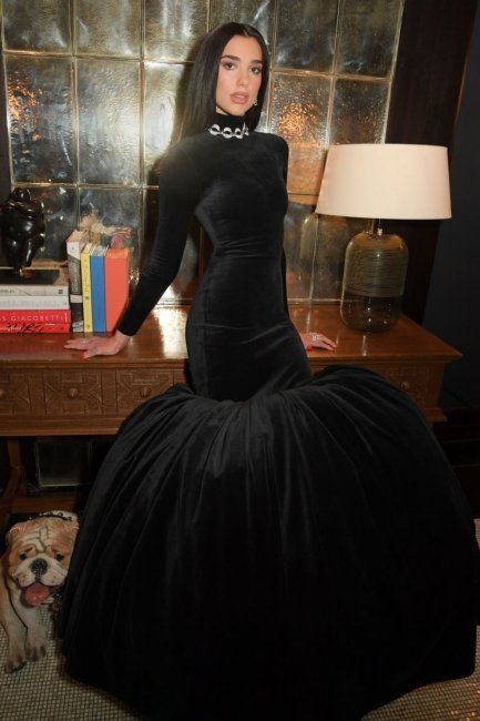 Дуа ЛипаВ качестве первого наряда Дуа Липа выбрала полупрозрачное платье Balenciaga с высоким воротом и рядами серебристых пайеток, плавно переходящих в ниспадающую бахрому. Певица дополнила образ эффектными серьгами и остроконечными белыми лодочками. Позже Дуа Липа переоделась в черное бархатное платье силуэта "русалка" с воротником-стойкой и длинными рукавами. Модница завершила свой образ массивным бриллиантовым колье и кольцом из белого золота Fabergé с 18-каратными бриллиантами.