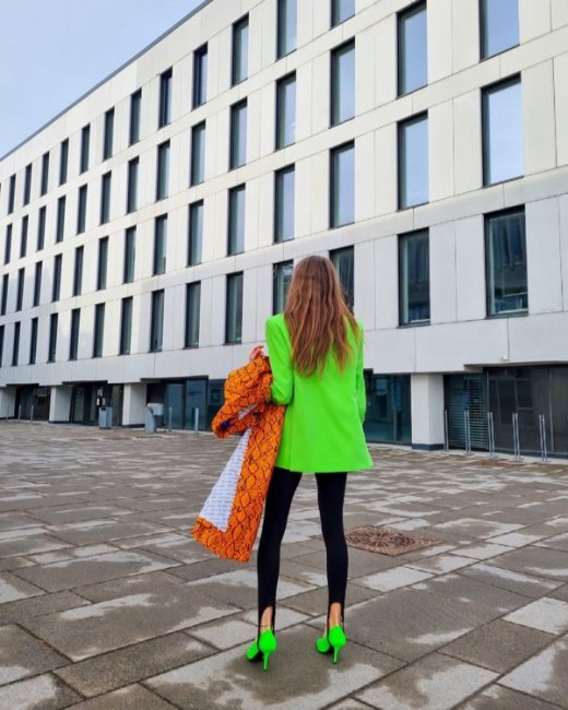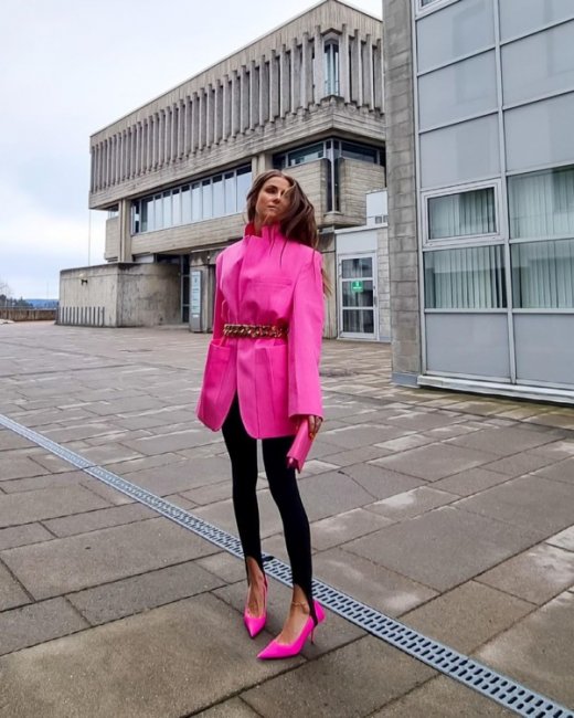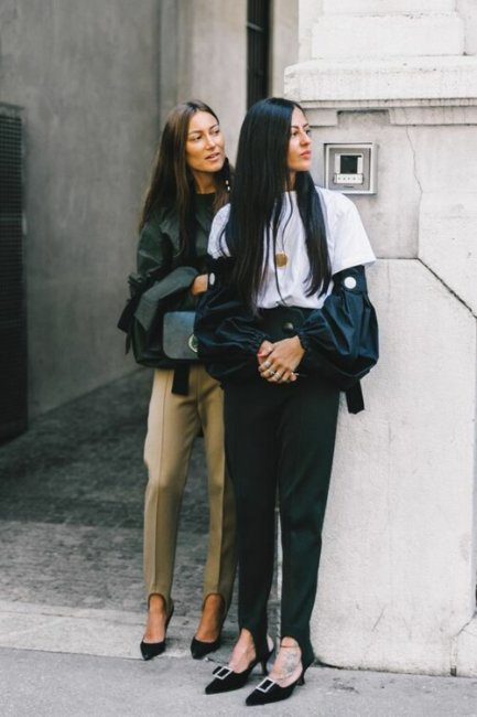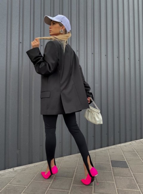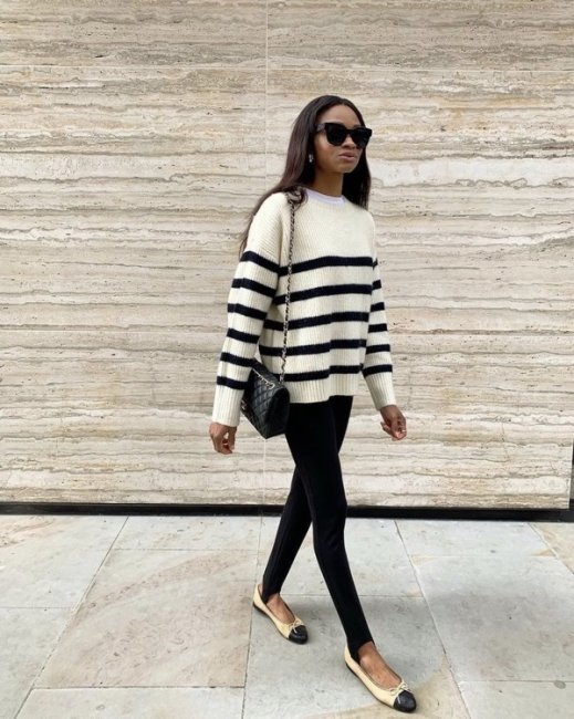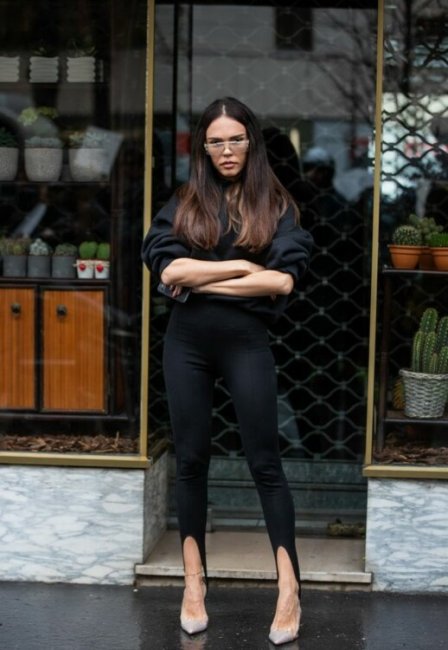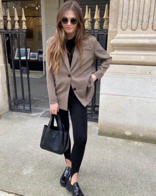 В этом сезоне весна-лето 2021 модницы выбирают леггинсы со штрипками, однако теперь штрипка служит не фиксатором, а декоративным элементом в образе, который как раз streestyle-звезды стремятся показать. Смело надевайте культовые лосины с каблуками, кроссовками, брогами и лоферами с массивной подошвой, а также с классическими балетками, которые вернулись в моду этой весной. Главное правило, которое следует запомнить: если вы надеваете обтягивающий низ, то сверху должна быть объемная одежда: маскулинный жакет, рубашка из мужского гардероба, свободный бомбер или худи.