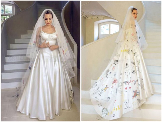 Эскиз свадебного платья Анджелины ДжолиПо случаю свадьбы с Брэдом Питтом Анджелина Джоли выбрала платье Atelier Versace. Над созданием наряда работал модельер Дома Луиджи Масси, а также шестеро детей Джоли и Питта. Масси перенес детские рисунки – разнообразные цветы, веселых человечков и прочие милые изображения – на подол платья и фату невесты. Автором обручальных колец для пары стал ювелир Роберт Прокоп, ранее создавший для Джоли ее помолвочное кольцо.