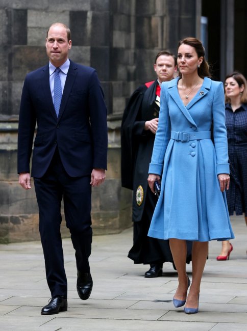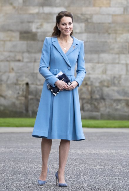 Кейт МиддлтонЗавершающим пунктом для супругов стала торжественная церемония закрытия Генеральной ассамблеи церкви Шотландии. Для этого мероприятия Кейт Миддлтон сделала ставку на нежно-голубое платье-пальто одного из своих любимых брендов Catherine Walker. Элегантный и женственный образ герцогиня Кембриджская дополнила клатчем Strathberry и остроносыми лодочками в тон образу. Наряд Кейт хорошо гармонировал с образом принца Уильяма, который выбрал темно-синий костюм, голубую рубашку и галстук с узором в цвет наряда жены.