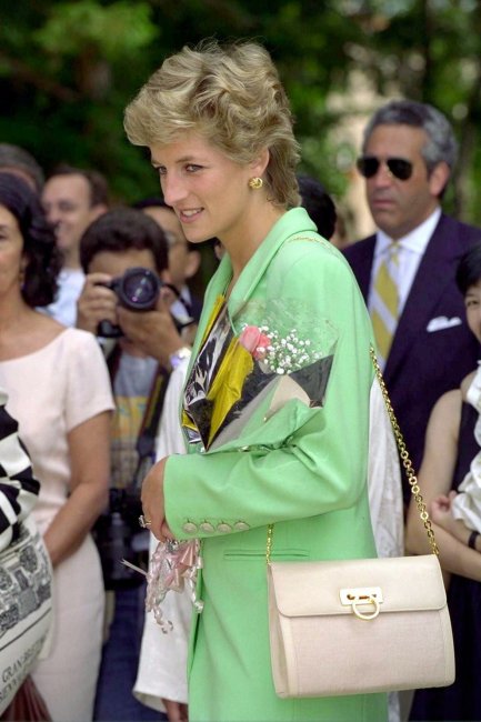 Принцесса Диана с сумкой Lady DiorСледуя по стопам Грейс Келли и Джейн Биркин, в честь которых Hermès назвали свои сумки, которые впоследствии стали культовыми, Диана вдохновила Christian Dior, Salvatore Ferragamo и Tod’s назвать в ее честь классические изделия из кожи. Сумка Lady Dior, первоначально известная как Chouchou, но переименованная в 1996 году, после того как леди Ди получила ее в подарок от Бернадетт Ширак и с тех пор редко появлялась без нее на публике, по сей день является знаковым аксессуаром модного Дома. Сумка Salvatore Ferragamo с ремешком-цепочкой, узнаваемая благодаря застежке Gancio с золотым обручем, получила имя Lady Di, когда выяснилось, что принцесса является поклонницей этого аксессуара. Сара Мауэр из Vogue однажды подсчитала, что принцессе Диане принадлежало более 20 сумок Lady Di.