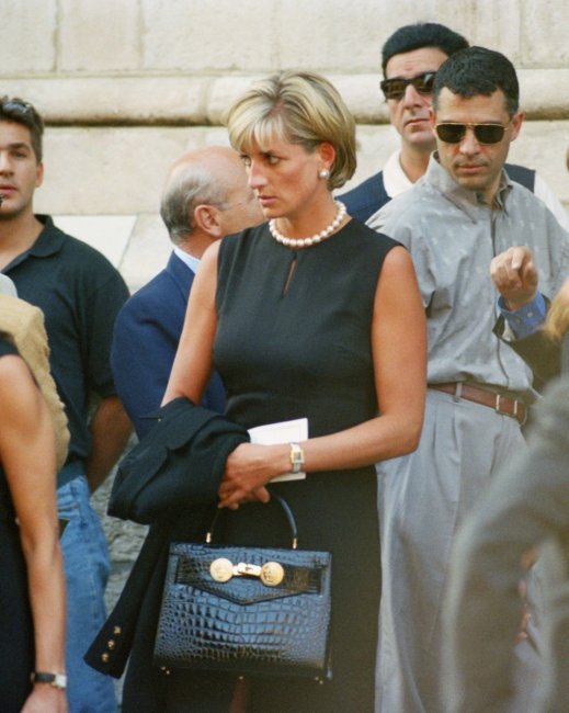Принцесса Диана с сумкой VersaceУчитывая ее близкие отношения с Джанни Версаче, удивительно, что нет сумки с эмблемой Медузы, названной в ее честь. Тем не менее, оригинальные модели бренда с короткими ручками сверху стали ее современной альтернативой одобренным королевской семьей сумкам Launer. Между тем сотрудничество Дианы с дизайнером Аней Хиндмарч показало ее с наиболее прониницательной стороны: атласные мини-клатчи, прикрывающие линию декольте, стали своеобразной защитой от любопытных взглядов прессы. В свете того, что ее декольте становилось все более глубоким (Диана воодушевлялась общением с Джанни), она обращалась к Ане за изготовлением атласных сумок-клатчей, которые она могла держать близко к груди, когда выходила из машины. Хиндмарч вышила букву D внутри аксессуаров, что стало их маленьким секретом.