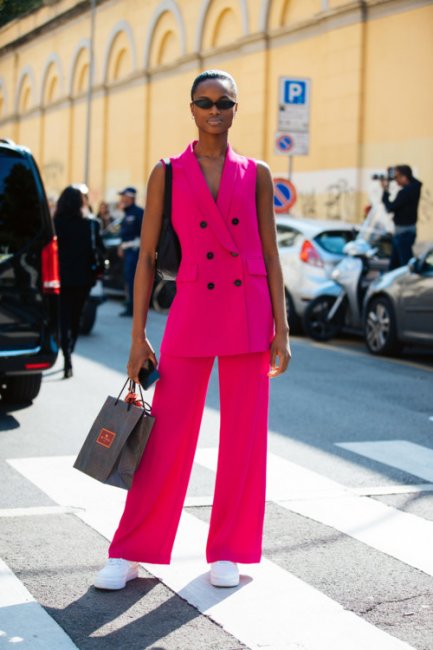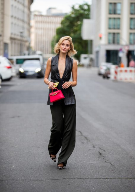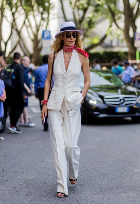 Брючный костюм с жилетом - беспроигрышный летний дуэт. Такой образ подчеркнет хрупкость и силу и не потребует дополнительного обыгрывания. Жилет лаконичного дизайна с минимальным количеством деталей советуем сочетать с широкими костюмными брюками-палаццо. Дополнить образ можно с помощью ярких аксессуаров и украшений: шляпы-федоры, шелкового платка и объемных браслетов.