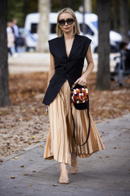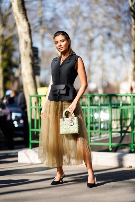 Воздушное и универсальное сочетание жилета и юбки длины миди - отнюдь не про корпоративный дресс-код. Обыграть приталенный верх советуем юбкой-плиссе, асимметричной моделью с аппликациями или полупрозрачным вариантом из органзы. Романтичное настроение образа подчеркнут аксессуары: туфли на каблуке kitten heel и геометрические сумки.
