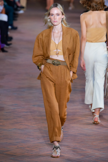 DiorAlberta FerrettiУкороченные льняные брюки, как в коллекции Dior и Alberta Ferretti, отсылающие к стилю сафари, вновь возглавляют модные тренды. Главные цвета - все оттенки песочного и бежевого, дополнять которые дизайнеры советуют топами той же палитры, классическими рубашками, а также неожиданными аксессуарами, вроде подвески с крупнокалиберным камнем или сумки с анималистичным принтом. Еще одна актуальная модель - нарочито широкие льняные брюки, которые особенно эффектны в сочетании с укороченным жакетом. Вдохновиться на стилизацию советуем коллекциями Stella McCartney и Nehera.