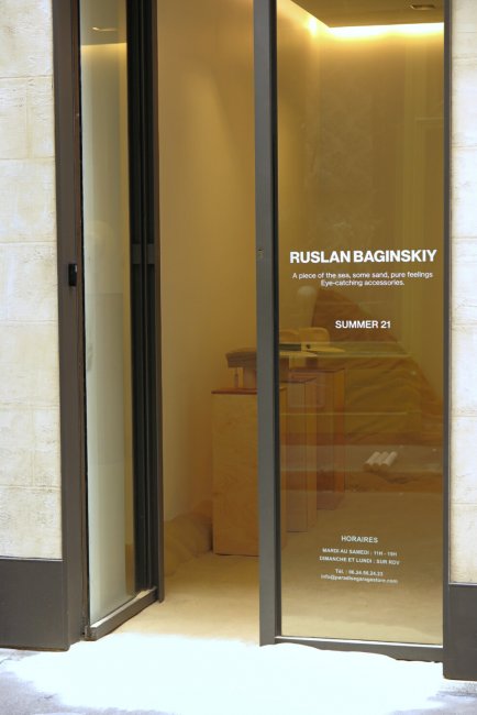 На время работы поп-ап бренд создал морское побережье в центре Парижа. Для инсталляции Руслан Багинский привез 10 человек из своей команды и тонну песка из Украины. По всему пространству первого этажа возвышаются песчаные дюны, в витрине – изготовленный из соломы логотип RB, по периметру – весенне-летняя коллекция 2021, а также первый дроп Resort 2022, который поступит в продажу в декабре.