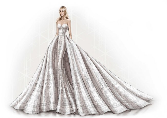 Эскиз свадебного платья Zuhair Murad для Софии Вергары"У нас не было возможности встретиться из-за плотного графика, поэтому мы очень тесно работали каждый день над созданием платья с ранних этапов: от создания эскизов и образов вышивки до дистанционной примерки. Мы несколько раз разговаривали по телефону, и София объяснила мне, что ей нравится и о чем мечтает. Я очень хорошо знаю ее стиль, поэтому мне нужно было что-то особенное, очень сексуальное и в то же время очень классическое, потому что речь шла о свадебном платье", - поделился дизайнер. Из-за изысканной техники, использованной при создании платья Вергары, оно было произведено на двух континентах: в парижском ателье и в Бейруте совместно работали над сказочным образом. "Невеста этого заслуживает!" – сказал ливанский кутюрье.