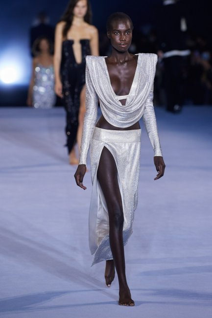 Металлические и драгоценные оттенки из сезона в сезон возвращаются в списки самых модных цветов. Дизайнеры вдохновились темой футуризма и предложили выбирать как образы из металлизированной кожи, шелка или ламе, так и наряды, расшитые пайетками, бахромой или стразами. В центре сюжета оказались: платья-кольчуги, топы в стиле диско, брюки, напоминающие шуршащую фольгу от конфет, элегантные платья с мягкими металлическими переливами и образы похожие на доспехи современных воительниц.