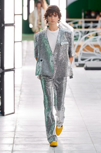 BalmainНе устоял перед серебристым цветом и Риккардо Тиши. Дизайнер завершил коллекцию Burberry весна-лето 2021 серией нарядных платьев, усыпанных крупными стразами. А Louis Vuitton и Paco Rabbane сделали ставку на пайетки. Чтобы не напоминать диско-шар на вечеринке, советуем разбавлять эффектные блестки лаконичными вещами. Например, базовой белой футболкой, как это делает Николя Гескьер или бежевыми брюками по примеру Пьерпаоло Пиччоли.