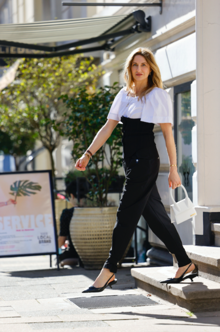 С брюкамиПомимо очевидных брюк-палаццо, советуем сочетать слингбэки с шелковыми брюками с легкими клешем или даже карго. Базовые однотонные аксессуары дополнят смелый образ.