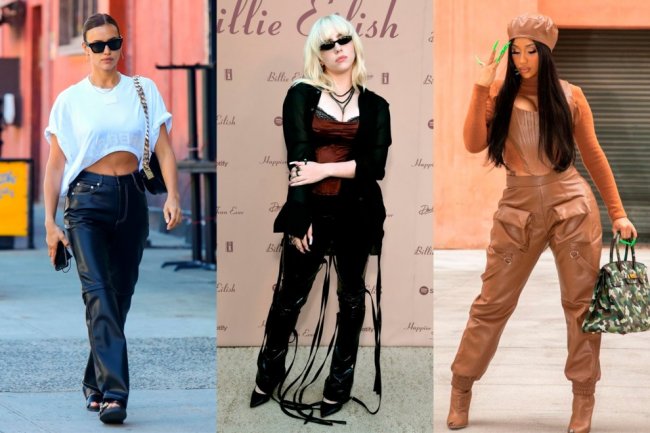 Кожаные брюкиИрина Шейк, Билли Айлиш, Карди БиНе обязательно быть рок-звездой, но кожаные брюки - главная must have позиция этой осени - доказывают Ирина Шейк, Билли Айлиш и Карди Би. Сочетайте их с простой белой футболкой, кружевной майкой, кожаным корсетом и лодочками на каблуках.