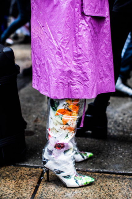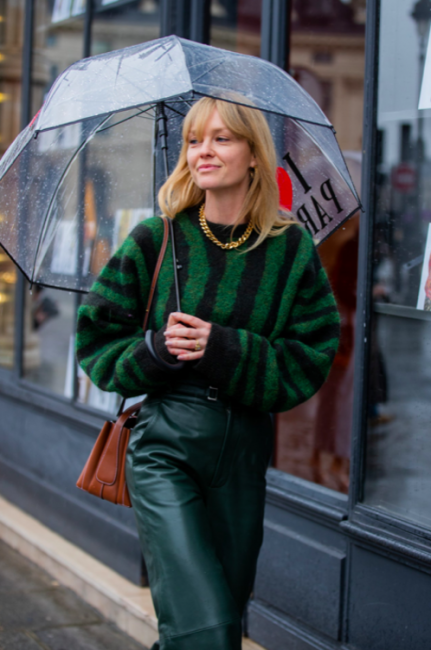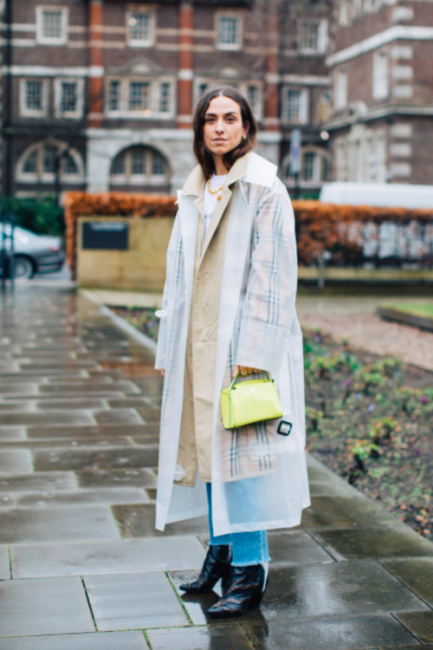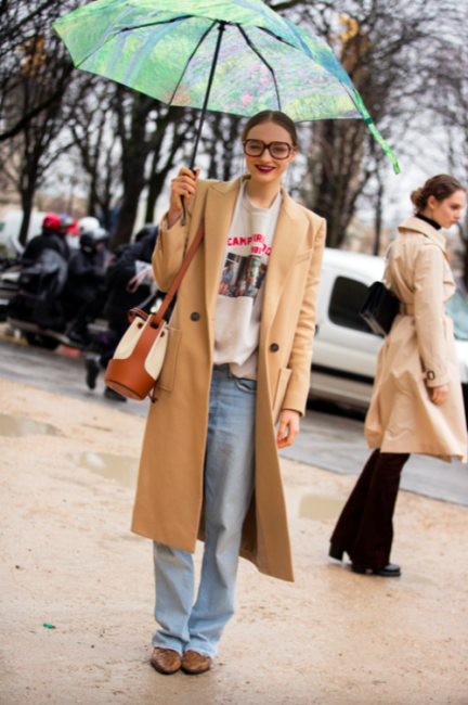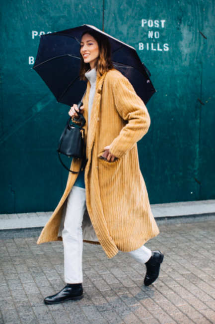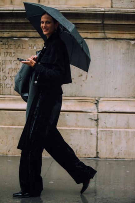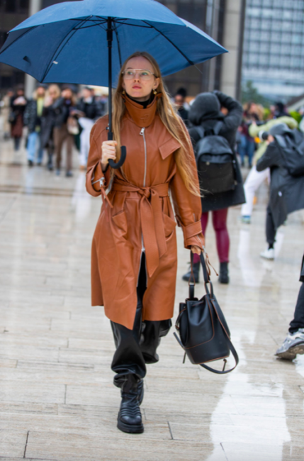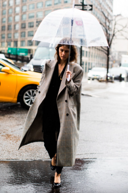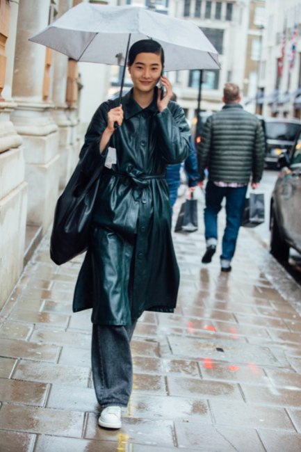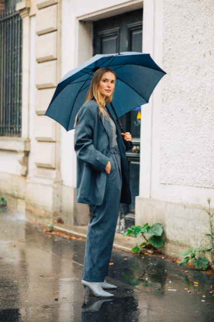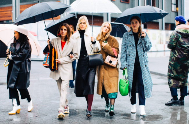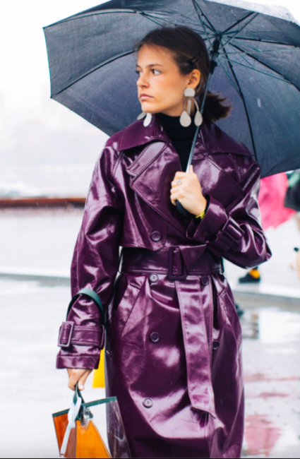 Нарядные блузы и структурные блейзеры сменяются на кожаные плащи, модные тренчи и объемные худи с капюшонами, а классические туфли-лодочки – на резиновые сапоги и челси на массивной подошве. Чаще всего в дождливую погоду модницы делают выбор в сторону макси-платьев, струящихся юбок и брюк-клеш. Помимо этого в ход идут бейсболки, панамы и платки, чтобы защитить прическу от непогоды, а улицы мировых столиц моды заполоняют элегантные зонты. Когда на улице идет дождь, streetstyle-звезды своим примером вдохновляют нас одеваться стильно, комфортно и практично. Vogue.ua собрал 55 образов с модных столиц, чтобы оставаться шикарными во время дождя.
