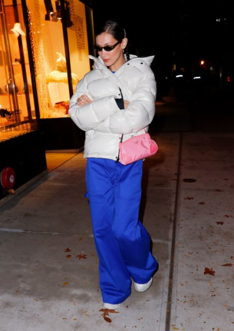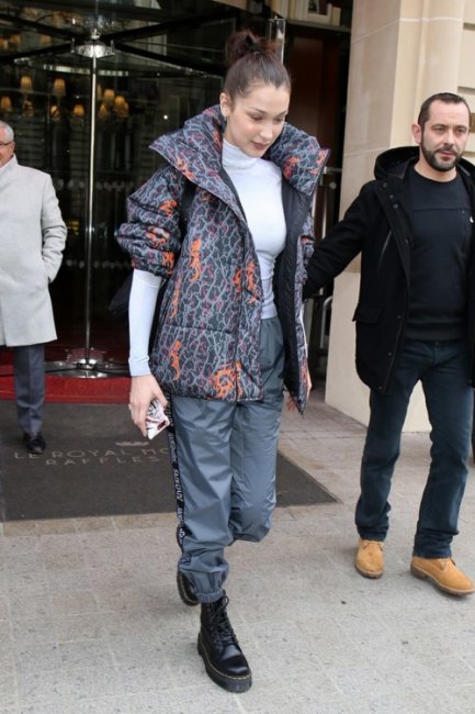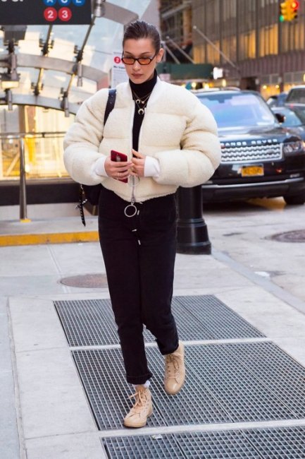Если в летний сезон Белла выбирает джинсовые куртки мужского кроя и удлиненные блейзеры, то в зимний период на помощь приходят объемные пуховики, дубленки маскулинного кроя и утепленные бомберы. Супермодель комбинирует их как со спортивными брюками и грубыми ботинками, так и с кожаными ансамблями и винтажным денимом.